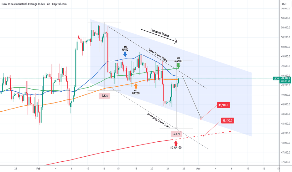 DOW JONES Channel Down potentially targeting the 1D MA100.Dow Jones (DJI) has been correcting within a Channel Down since its February 10 High. Right now it is below all major 4H MA trend-lines. The 4H MA100 (green trend-line) is exactly on the Inner Lower Highs and as long as it holds, the index could target at least 48500.