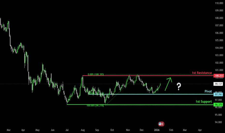 Bullish bounce off?US Dollar Index (DXY) has bounced off the pivot, which aligns with the 61.8% Fibonacci retracement, and could rise to the multi-swing high resistance.