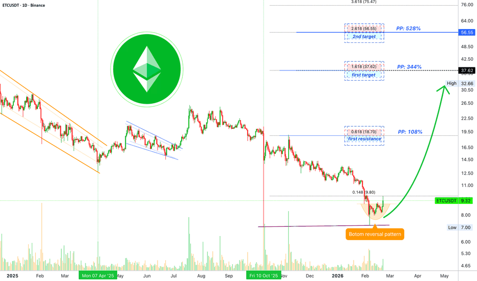 Ethereum Classic produced the full reversal sequence and bottom formation, with a rounded bottom pattern. It is already complete, over and confirmed based on today's candle. The full formation is in and this confirms also the bullish extension, rise and continuation.
