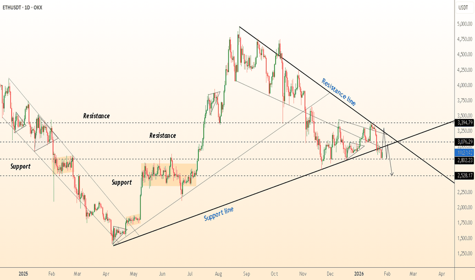 ● ETH/USD broke down from a rising channel after failing to hold the upper trendline, followed by a sharp impulsive sell-off that invalidated the prior bullish structure. The loss of the key resistance zone near 3,050–3,080 confirms a bearish shift in market control.