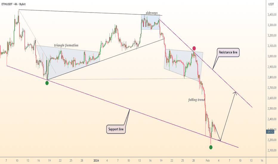 ● ETH/USD has completed a sharp corrective leg into the long-term descending support line near 2,200, where price shows stabilization after an impulsive sell-off. The reaction from this zone suggests seller exhaustion and a potential base formation.