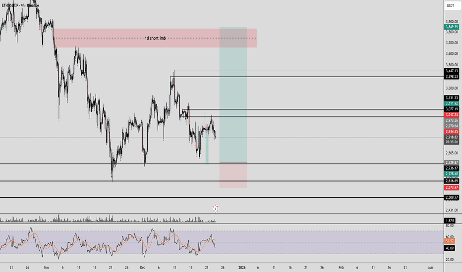 ETH on H1 remains in a corrective / range-bound structure. A high-quality liquidity pool sits at 2,886, perfectly aligned with the BPR mid-line, making it the most logical draw-on-price for any fresh move. Markets typically seek liquidity before initiating a new leg, so a rotation into this zone is the base expectation.