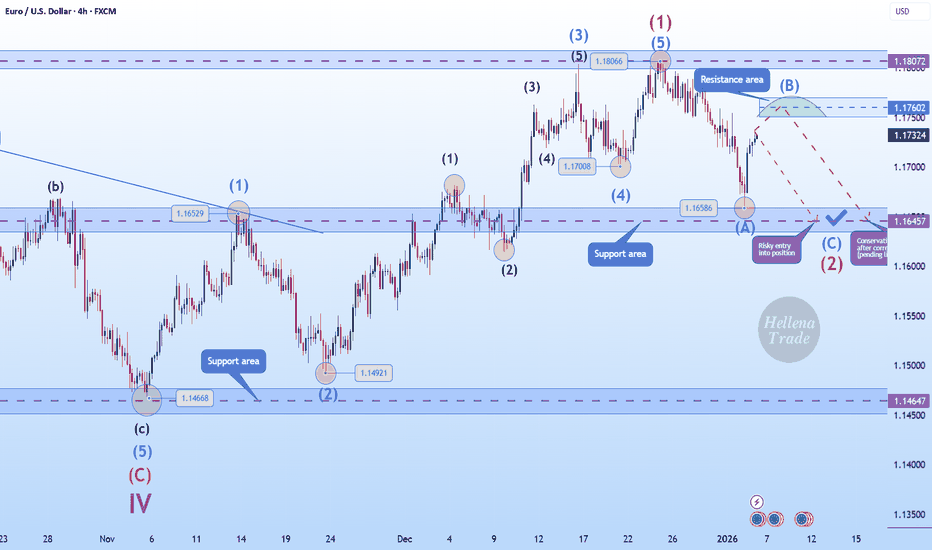 Hellena | EUR/USD (4H): SHORT to support area 1.16457 (ABC).Colleagues, judging by the nature of wave “2” movement, I assume that the correction is not yet complete. This movement is slightly stretched, and we can clearly see waves “A” and ‘B’, which means we can expect an update of wave “A” minimum and reaching at least the support level of 1.16457.