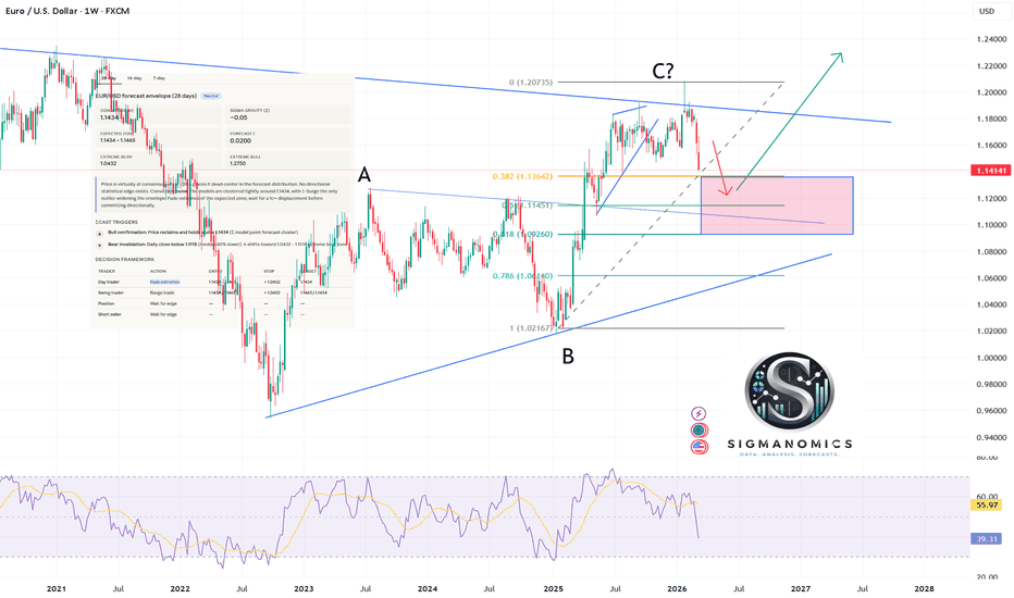EUR/USD Sigma Range now — eyes pullbacks into 1.12–1.1360EURUSD currently trading at 1.1424 eyes key support in the 1.115-1.0920 area in the next couple of weeks before the chance of a resumption higher. Our 28 day forecast is an expectation trading zone of 1.1434 – 1.1465 with an extreme high of 1.2750 and extreme low of 1.0432.
