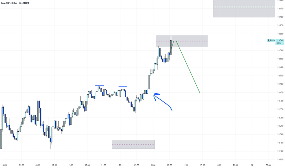 EURUSD SHORT IDEAbullish trend, and finally the price in my opinion will want another peak up, since there is still no bearish divergence for the beginning of the correction of the last leg up by 1x. There are definitely two peaks that were broken with great momentum (marked in blue), that is, a liquidity void. Before that, the price supposedly started to make some correction down, but then they pumped up. It is logical for me that the price will return down, with the first target being 1.16455 by 15m, and then it will show whether it wants a deeper correction by 1x 😊 + there is a absorption of the last bullish bar up, so I think a new peak and then a continuation down 😊