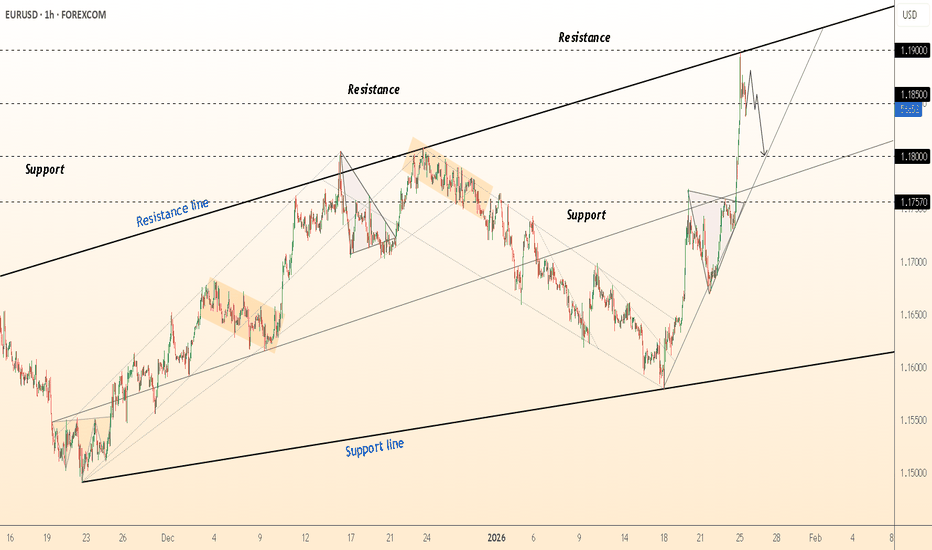 ● EUR/USD continues to respect a descending resistance line, but repeated defenses of the 1.1900 support area signal selling pressure is weakening. Higher lows near support and a failed breakdown suggest a short-term base is forming.