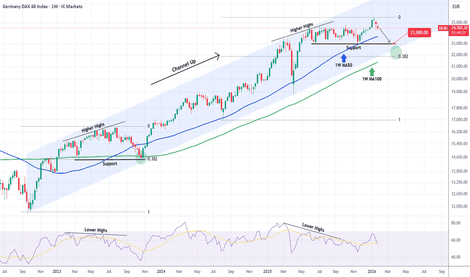 This is what happened with the October 23 2023 bottom, so our medium-term Target is now 23000 (Support). Notice that the 2023 Low also made contact with the 1W MA100 (green trend-line) and the 0.382 Fibonacci retracement level, so that could put the validity of DAX's 3-year Channel Up to test.