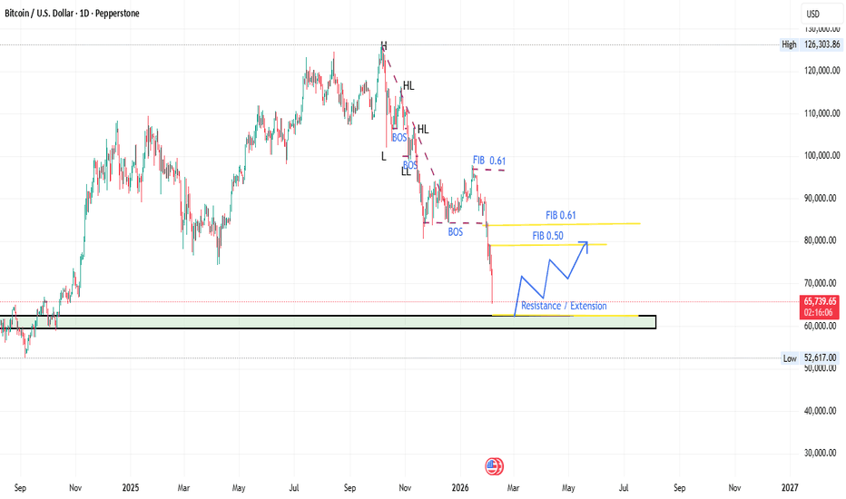 After distribution near the 79,000–78,000 resistance range, BTC experienced a strong impulsive sell-off, confirming bearish dominance. The breakdown below 73,000 accelerated momentum toward the 69,000 liquidity pocket. Current bounce appears corrective rather than a trend reversal. As long as price remains below the broken structure and supply zones, overall bias stays bearish, with only intraday pullback opportunities for buyers.