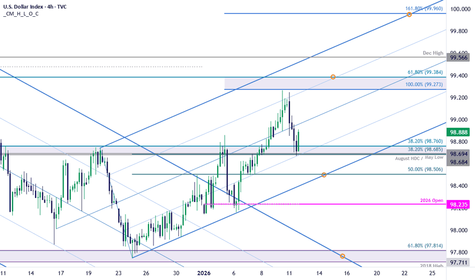 DXY Set to Snap Four-day Winning Streak- Support in ViewThe Dollar Index is poised to snap a four-day winning streak with DXY turning just ahead of confluent resistance today at 99.27/38- a region defined by the 100% extension of the late-December rally and the 61.8% retracement of the November decline. A 0.6% decline off the monthly high is testing confluent support into the start of the U.S. session at 98.68/76. The immediate focus is on this pivot zone into the start of the week where the 38.2% retracement converges on the August high-day close (HDC) and the May low.
