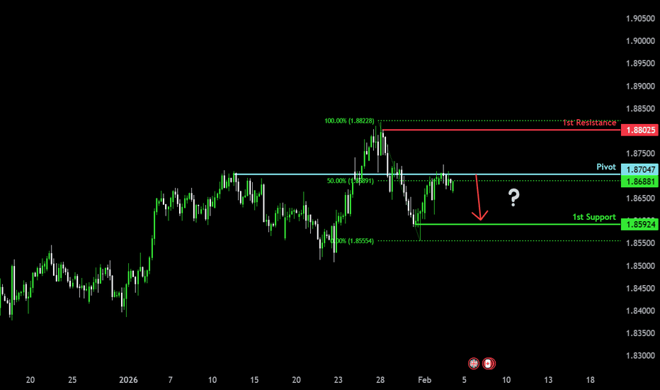Bearish continuation setup?EUR/AUD could rise towards the pivot, which is a pullback resistance that aligns with the 50% Fibonacci retracement and could reverse to the 1st support.
