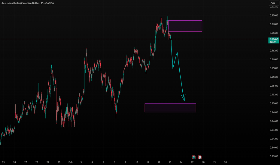 AUD/CAD Technical Outlook: Bearish Target at 0.9500The OANDA:AUDCAD pair is currently facing significant overhead supply at the 0.9645 level. A failure to consolidate above this multi-month resistance suggests a liquidity grab (fakeout) followed by a structural shift. We anticipate a corrective move targeting the 0.9500 psychological handle, representing a price decline of approximately 1.5%.