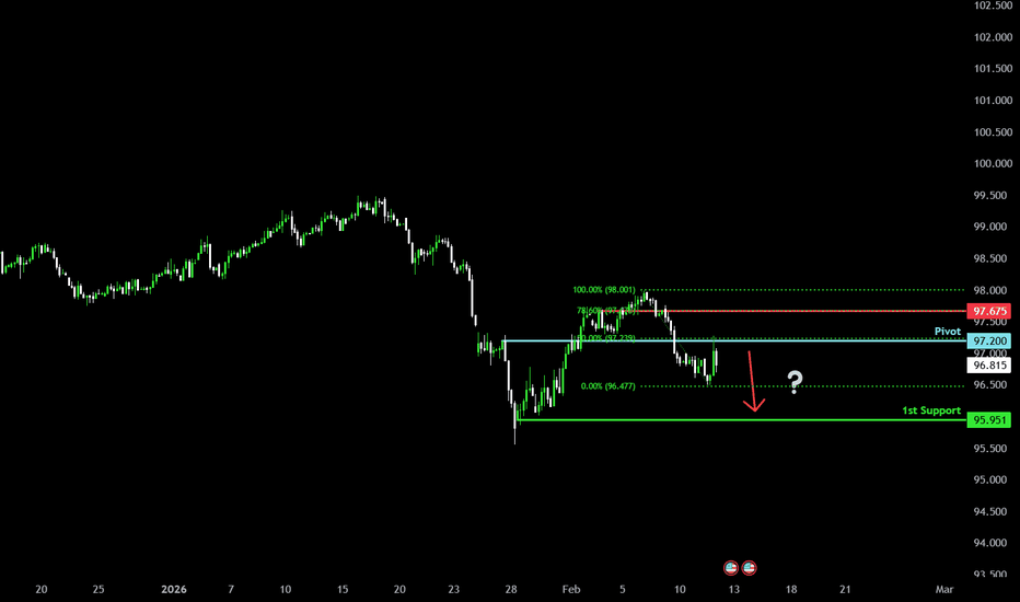 Bearish reversal off 50% Fib resistance?US Dollar Index 9DXY) has rejected off the pivot, which is a pullback resistance that aligns with the 50% Fibonacci retracement, and could drop to the 1st support.