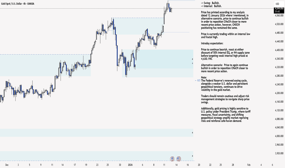 **UPDATE** XAU/USD 13 January 2026 Intraday Analysis **Please ignore previous analysis as H4 CHoCH was repositioned**