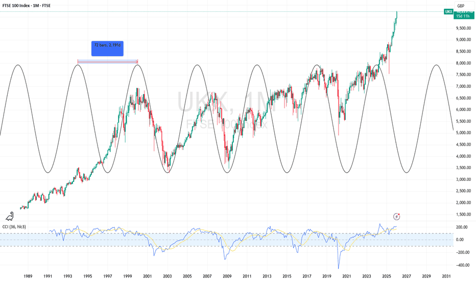 FTSE 100 – Long-Term Cycle Context (Monthly)The FTSE continues to respect its dominant multi-year cycle, with price currently extended above the cyclical midline following a strong advance.