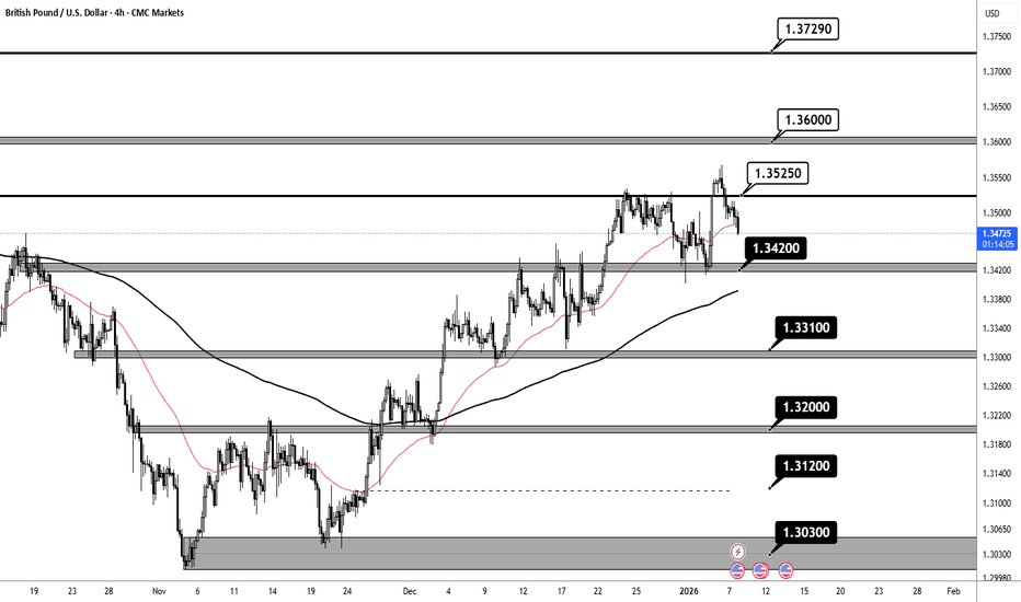 FOREXCOM:GBPUSD GBP/USD has rebounded sharply from the 1.3449–1.3454 support zone, but the recovery has stalled near the 1.3479–1.3484 resistance zone, which aligns with a descending trendline resistance from the late-December highs. This confluence has capped upside attempts so far.