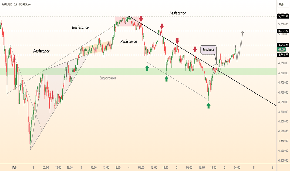 ● Price broke the descending trendline breakout at key resistance and reclaimed the support zone around ~4,800–4,850, signaling buyers stepping in and short‑term reversal momentum.