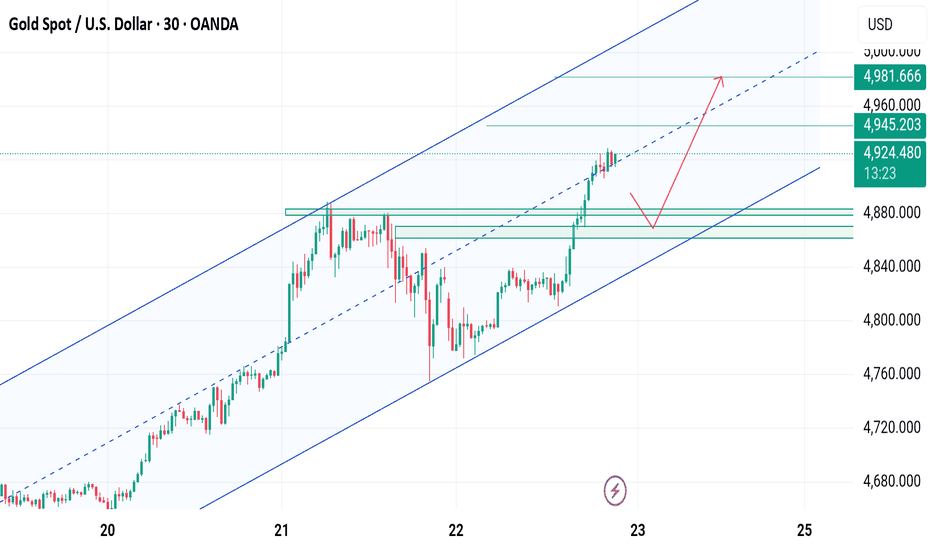 GOLD XAUUSD 4979.44 WILL BE WATCHED ON 15 MIN FOR REACTION.ON DAILY WE HAVE A BREAKOUT OF ASCENDING TRENDLINE AND A PATTERN.