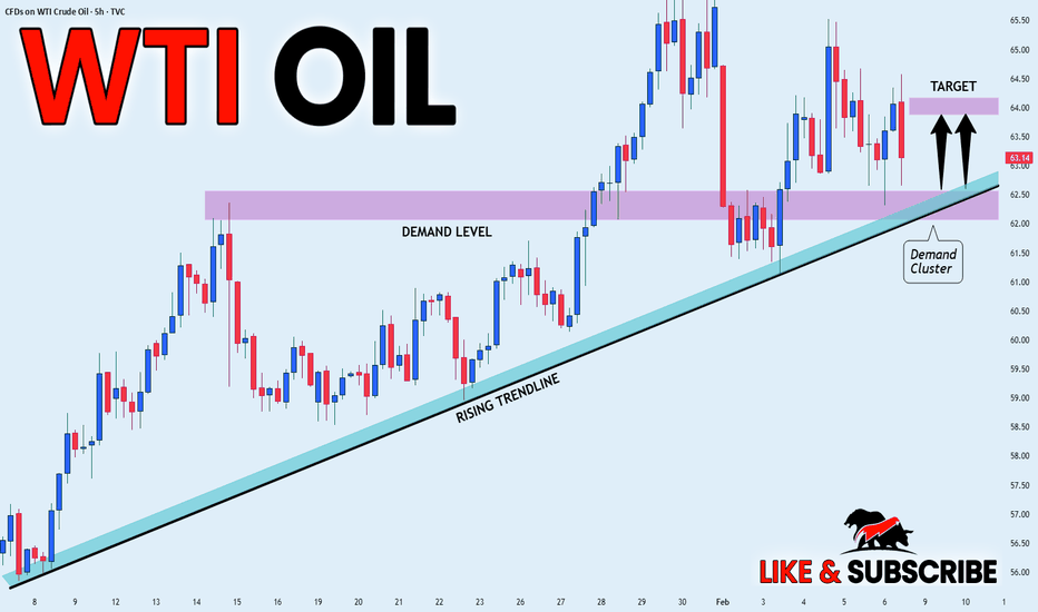 ✅WTI OIL holds a strong demand cluster aligned with the rising trendline, keeping bullish structure intact. Discounted reactions suggest smart money support, favoring continuation toward higher buy-side liquidity. Time Frame 5H.