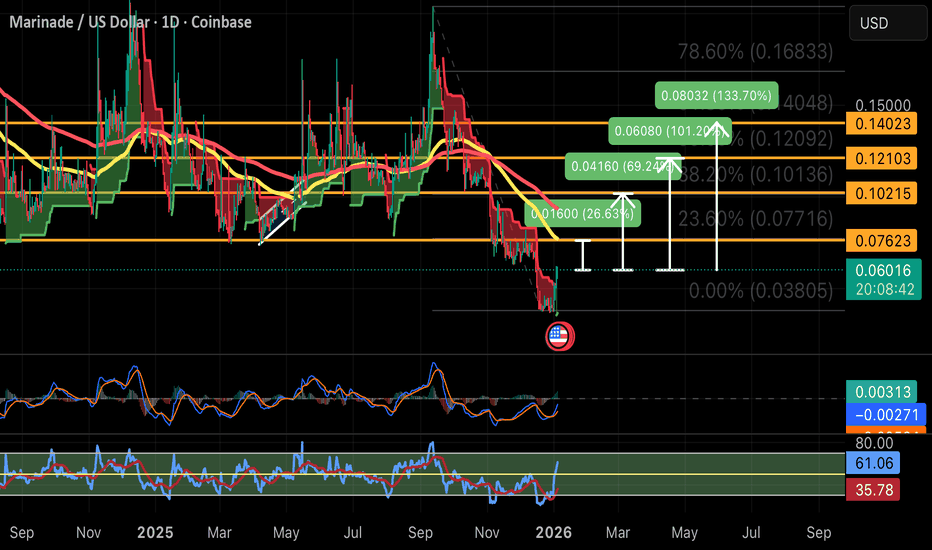 MNDE - Is marinade setting up for a bullish rally?Looking at a macro timeframe we can see that marinade has set a new low I re plotted the Fibonacci for us it hasn't had a rally in quite some time as of the end of December the marinade team has paused buybacks so they can focus capital towards MSOL.