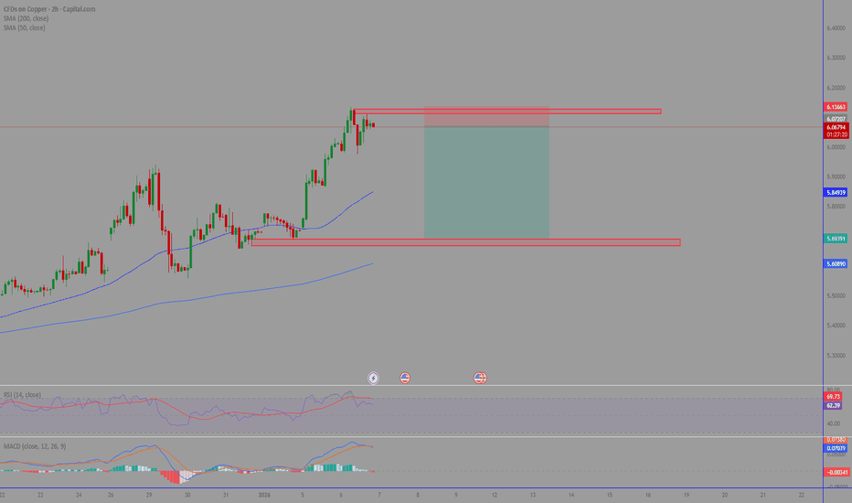 Copper starting a pullback?Copper has been on a strong run, breaking its all-time high, but the upward trend is currently losing momentum. After price rejected a key level and the 2H MACD showed signs of a potential pullback, I believe copper may start to decline and retest previous support zones to find demand for a new rally. I believe this pullback will be similar to the one seen in late December, and that after finding support, copper could potentially reach new all-time highs.The larger trend remains very bullish, as price, RSI, and MACD are consistently producing higher highs and higher lows.