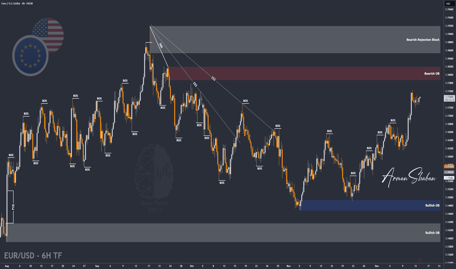 EUR/USD | EURUSD Approaching Key Supply Zone, What's Next ?By analyzing the #EURUSD chart on the 6 hour timeframe, we can see that price is currently trading around 1.174. I expect EURUSD to first push up toward the 1.178 to 1.182 zone, and once price reaches this supply area, a bearish reaction is likely.