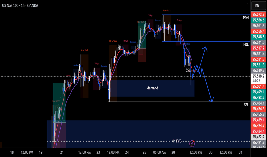NAS100 Intraday Rebound Setup (1H)After a strong downside sweep into the lower liquidity pocket, NAS100 is showing its first signs of stabilization on the 1-hour chart. Price has tapped directly into a confluence of demand and prior inefficiency, creating conditions for a corrective bounce back toward the nearest redistribution zone above.