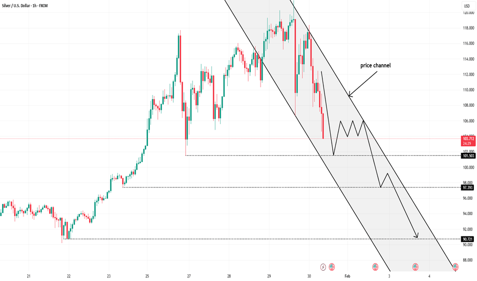 Silver Has Broken Structure — The Channel Now Defines DownsideSilver has clearly transitioned from an impulsive uptrend into a bearish price channel, and the latest sell-off confirms that this is no longer a healthy pullback. After failing to hold the previous highs, price broke structure decisively and began printing lower highs and lower lows, signaling a shift in short-term market control from buyers to sellers. The descending channel now acts as the primary framework. Every rebound inside this structure has been corrective and capped by channel resistance, which is classic sell-the-rally behavior. The sharp bearish candles show initiative selling, not just profit-taking, suggesting that supply is active and confident. As long as price remains below the channel midline and upper boundary, upside attempts are likely to be faded. From a supplydemand perspective, the failed rebound zones above are acting as overhead supply, while price is gravitating toward lower liquidity pools. The next key downside magnets sit around the 102.00 area first, followed by the deeper support near 97.30, and ultimately the larger liquidity pocket closer to 90.70 if momentum accelerates.