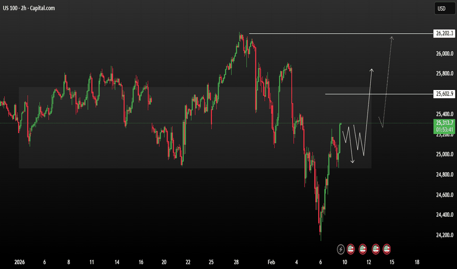 USNAS100 consolidation bullish range formationUS100 trading in a broad consolidation a rebound Price recently formed a strong bullish recovery from the February low near 24,300, followed by a corrective pullback and short-term range formation.