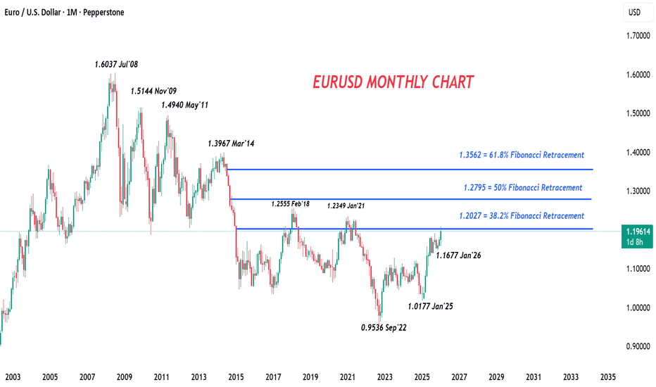 EURUSD has drawn plenty of attention recently, with fresh upside acceleration driven in part by heavy selling pressure on the US Dollar. However, to properly frame this move within a broader context, it’s worth stepping back to the monthly EURUSD chart below, which captures price behaviour all the way back to July 2008. This longer‑term view helps clarify where the latest strength sits within the wider structural picture.