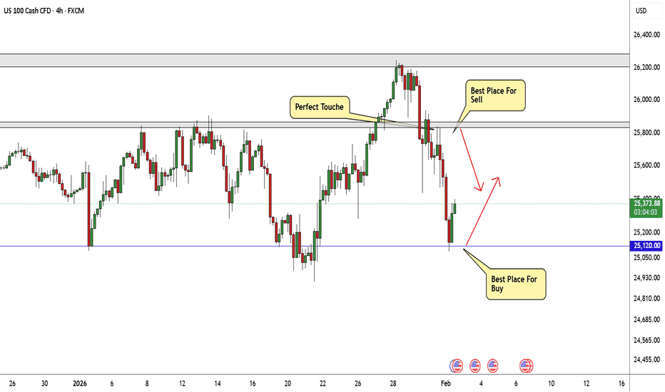 Nasdaq Best Places To Buy And Sell Cleared , 800 Pips Waiting !Here is m y opinion on NASDAQ On 4H T.F , We have a Huge movement To Downside as i mentioned in my last Analysis About Nasdaq & Then to Upside Now , and we have a good range for buy and sell started between 25120.00 to 25800.00 so we can buy and sell n\Nasdaq This Week from 2 areas , 25120.00 will be the best place for Buy and 25800.00 will be the best place for Sell , now the price very near buy area so we can Enter a buy trade when the price back to retest the area one more time and targeting 25800.00 and when the price touch it and give us a good bearish P.A , we can enter a sell trade and targeting 25120.00 , It`s All Depend On Price action , if we have a daily closure below our support then this idea will not be valid anymore .