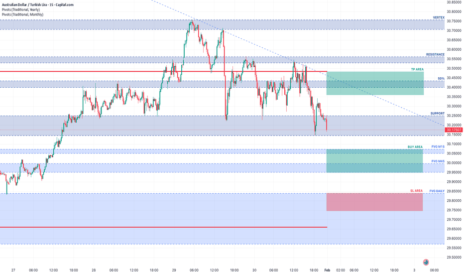AUD/TRY#1 – H15 Pullback & FVG Buy Zones (M15 / H4 / Daily)🔹 Market Structure :