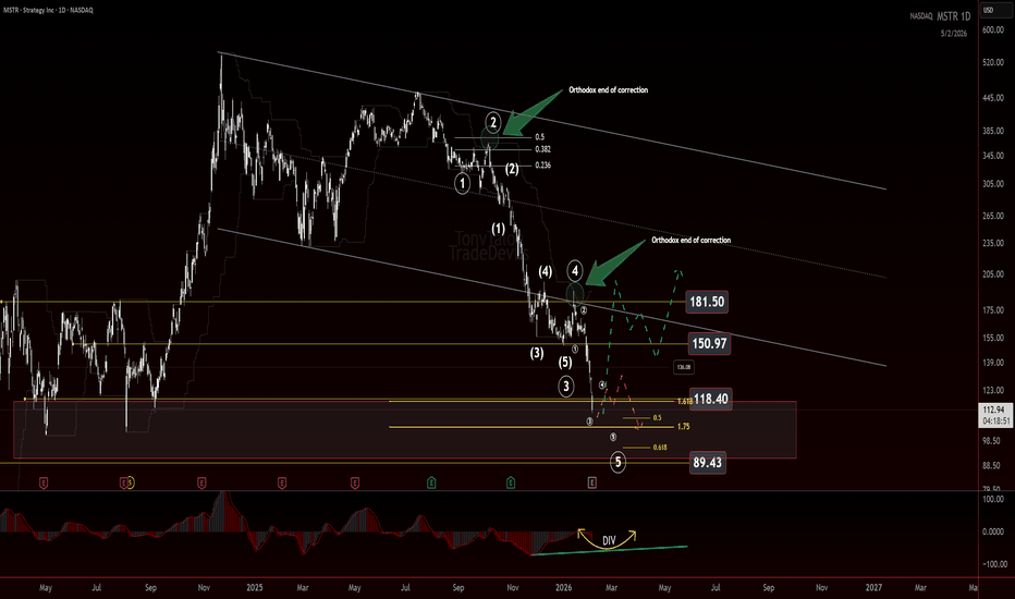 MSTR at the larger degree of the Elliott Wave structure is still being resolved. What stands out is the most recent move down, which has the look and behavior of a motive wave. If that interpretation is correct, this impulse may be nearing completion.