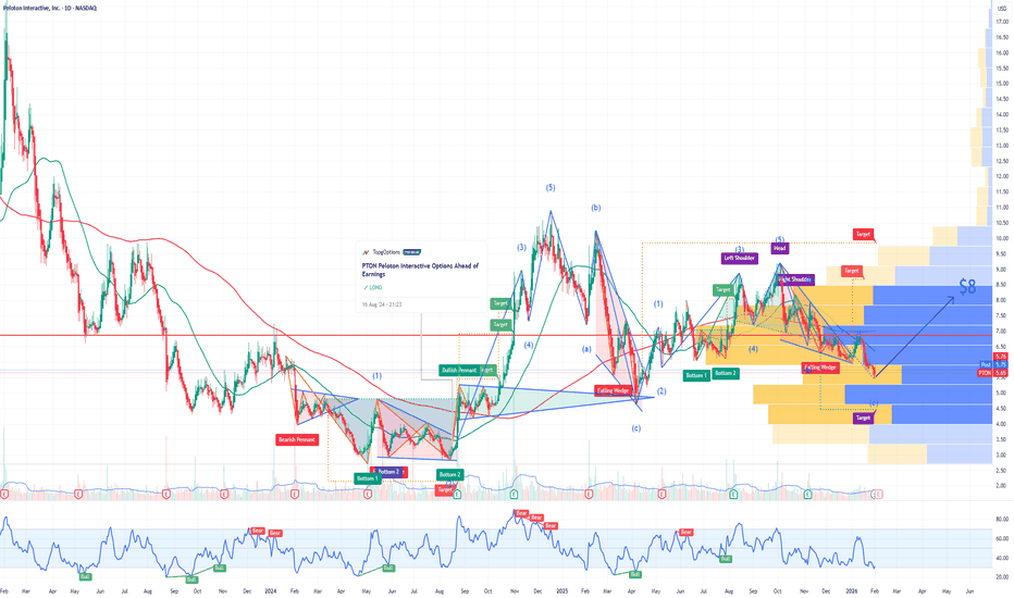 Now analyzing the options chain and the chart patterns of PTON Peloton Interactive prior to the earnings report this week,