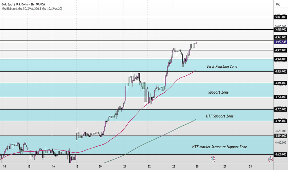 Rejection at 4993 would likely trigger a pullback into lower support zones. The first reaction zone aligns with the MA50 and will be the first area to watch for support. Failure to hold there could lead to a deeper retracement into the lower support zone.