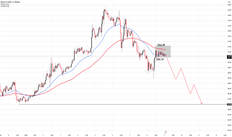 Price fails to break and accept above EMA 34–EMA 89 resistance. A rejection from this EMA zone would confirm continuation of the bearish structure, opening the path toward the 89.2k level first, followed by a deeper move into the 87.2k support zone.