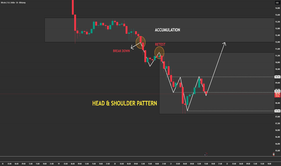 Bitcoin’s Head & Shoulders Has Played Out - Market Is ResettingOn the BTC H1 chart, the market has already completed a clean Head & Shoulders distribution, followed by a decisive breakdown and textbook retest, confirming bearish control in the prior structure. The impulsive sell-off after the retest flushed liquidity aggressively, signaling that weak longs were fully cleared. However, the key shift now is context: price is no longer trending impulsively lower. Instead, BTC has transitioned into a post-distribution accumulation range, marked by compressed, overlapping candles and diminishing downside momentum. This behavior suggests bearish momentum exhaustion, not trend continuation.