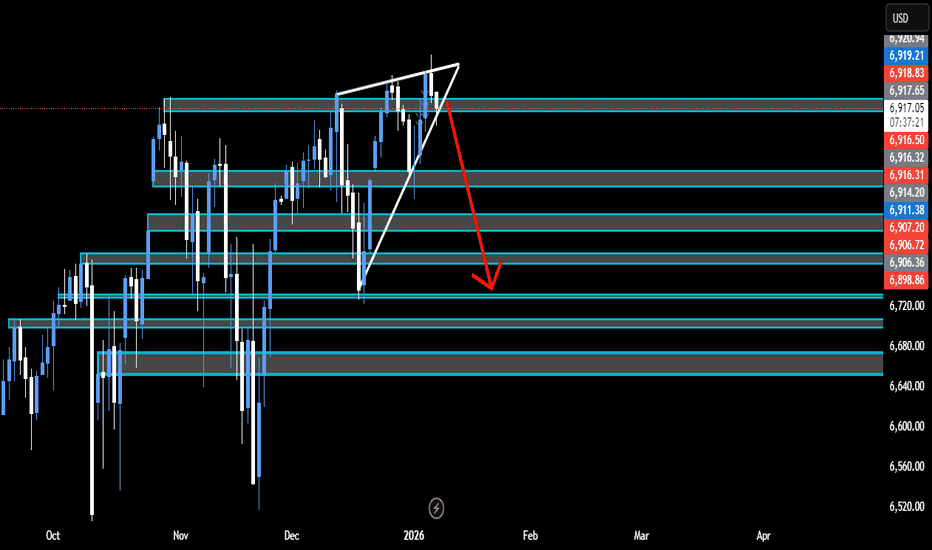SP-500 Bearish Indications- Overall Market AnalysisDaily Time Frame- Rising Wedge is a bearish reversal pattern. If the Daily breaks out of this pattern at any point towards the downside we should see price reach the previous support levels around 6840.00.