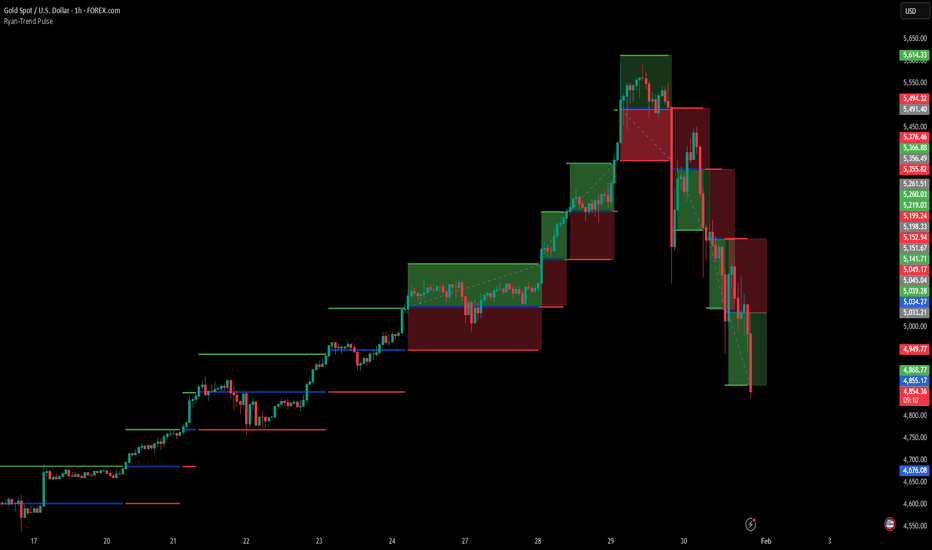 #XAUUSD (Gold) -Trend Analysis: 26/01/26 to 30/01/26#XAUUSD 1H chart illustrates the performance of the Ryan-Trend Pulse indicator during the final week of January 2026. showing how a systematic approach can navigate both parabolic rallies and sharp trend reversals.