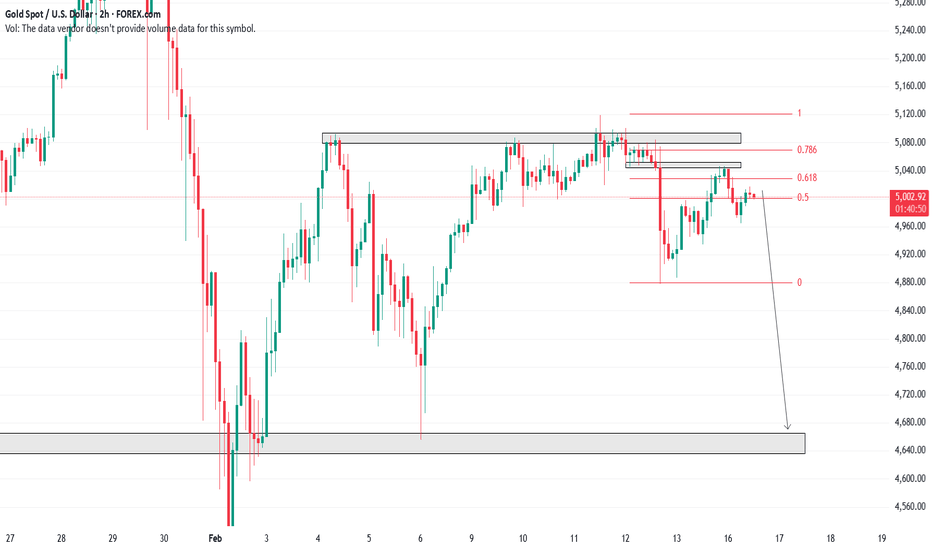 XAU/USD: Gold Under PressureThe current technical analysis of Gold (XAU/USD) on the hourly (1h) timeframe shows a market structure in transition, marked by selling pressure following a failure below a major resistance zone. After reaching a local peak, the price began a correction that brought it back below the psychological level of $5001.10. We observe the use of Fibonacci retracement levels, where the price seems to reject the 0.5 (50%) and 0.618 (61.8%) zones—crucial levels that often serve as reversal points for a bearish continuation within a corrective trend.