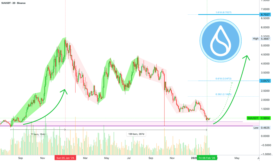 Sui headed towards a new all-time high?SUIUSDT just activated the late September 2024 price range, the same level that supported a 1,000%+ bullish wave. This exact level was tested on a wick only which shows buyers were present; ready to buy, ready to hold, ready to trade.