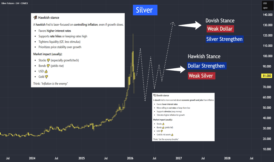 Silver Ranges Before Heading Up AgainIf the U.S. Senate approves Kevin Warsh as the next Fed Chair, he would take over when Powell’s term ends in mid-May 2026. His first major policy decision would likely be on 17 June 2026. As silver is tied to U.S. dollar movements, which are closely related to interest rate decisions, uncertainty will persist from now until then, and even thereafter. When markets are uncertain, they tend to range before the dollar reveals its true strength or weakness following interest-rate changes.
