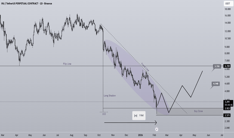 INJ Price Action: Hidden Support Zone Revealed! (1D)On the INJ chart, we can clearly see a large long shadow (wick) that has been barely filled. These long shadows often act like price gaps on the chart, meaning the market tends to revisit them in the future to complete unfinished price action. This makes them very important zones for future reactions.