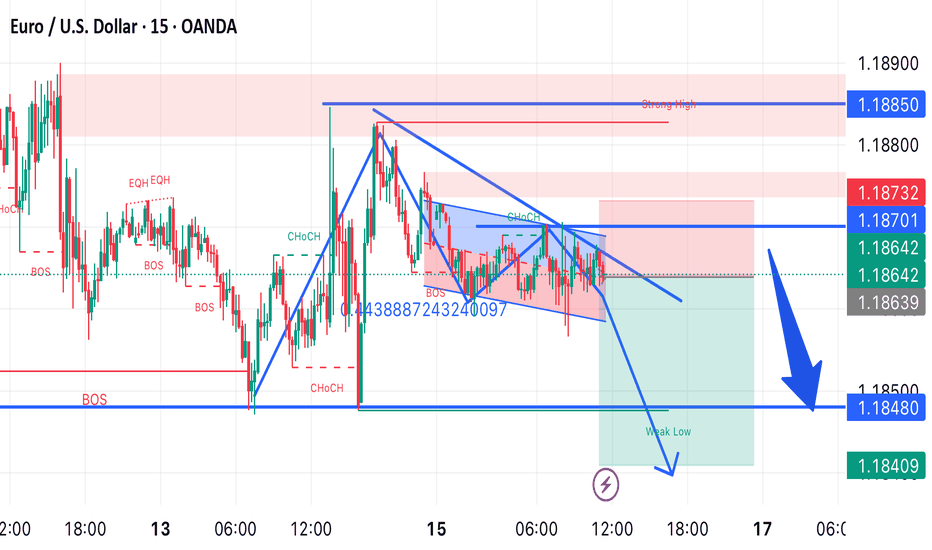 EUR/USD Bearish SMC Setup | CHoCH + Supply Tap at Strong HighThis analysis explores a high-probability short opportunity on the EUR/USD 15m timeframe, following a clear rejection from a premium supply zone.