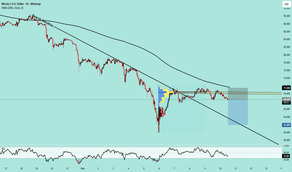 BTCUSD H1 Breakdown Risk | 68,600 Sell Toward 62,000 On the H1 timeframe, BTCUSD continues to show a bearish market structure. Although price briefly broke the short-term bearish trendline, the move failed to sustain. Price faced a clear rejection below the 200 DMA, confirming that higher levels are still being sold. The RSI around 37–40 indicates weak bullish momentum and supports the bearish continuation bias. Additionally, the Fixed Range Volume Profile (FRVP) high-volume area is being respected as a strong resistance zone, keeping selling pressure active.