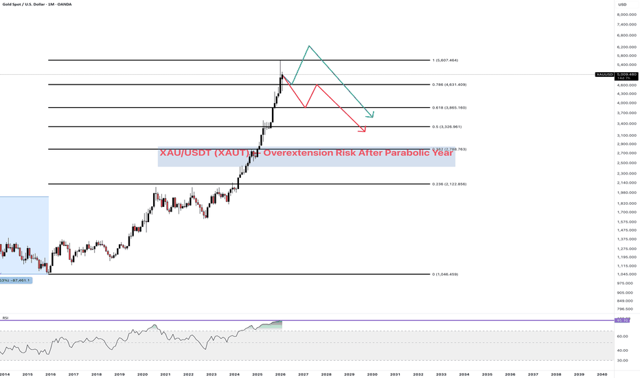 XAU/USDT — Overextension Risk After Parabolic YearGold has delivered nearly 2× in a year, following an additional +35% move before that.