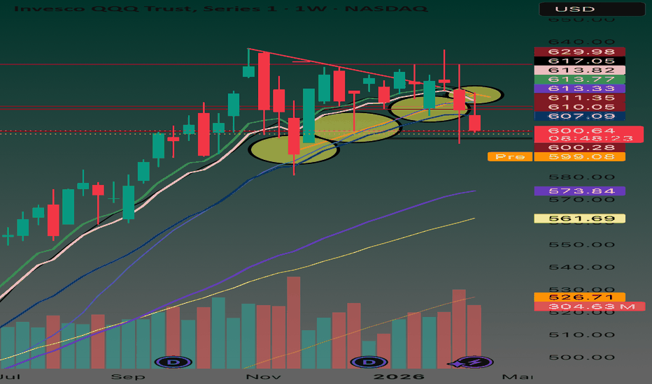 NASDAQ:QQQ has closed BELOW the 20WMA - a rare and significant signal that typically precedes further downside. We’re already under the 100D SMA for the second time in 10 days, and my proprietary 10SMA/10EMA cross just flipped BEARISH (black line crossed pink from the underside). The 50WMA sits at $562, which represents approximately -6.5% downside from current levels. If we don’t bounce next week and close above my support Ribbon, significant downside remains on the table.