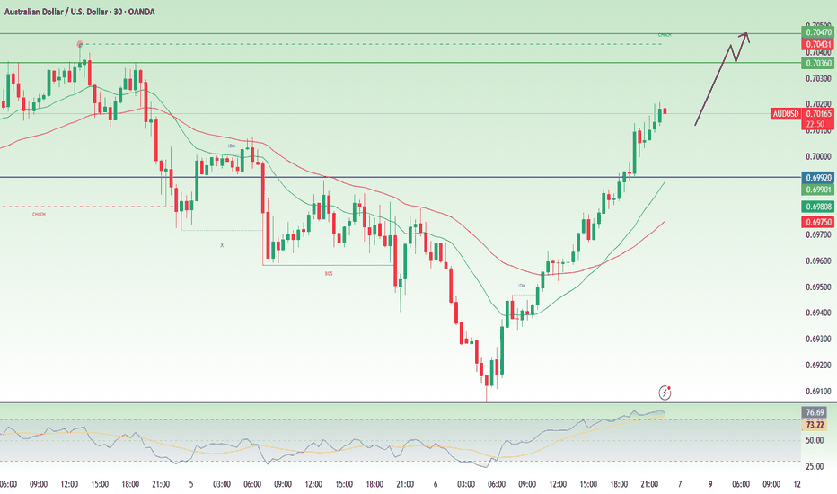 AUD/USD Analysis: Bullish Target 0.7057 | Bullish Above 0.6992The AUD/USD pair is showing strong intraday momentum on the 30-minute chart. After finding solid support at the 0.6992 pivot level, the price has pushed higher and is currently trading around 0.7010. The overall trend remains positive as long as we hold above our key support zone.
