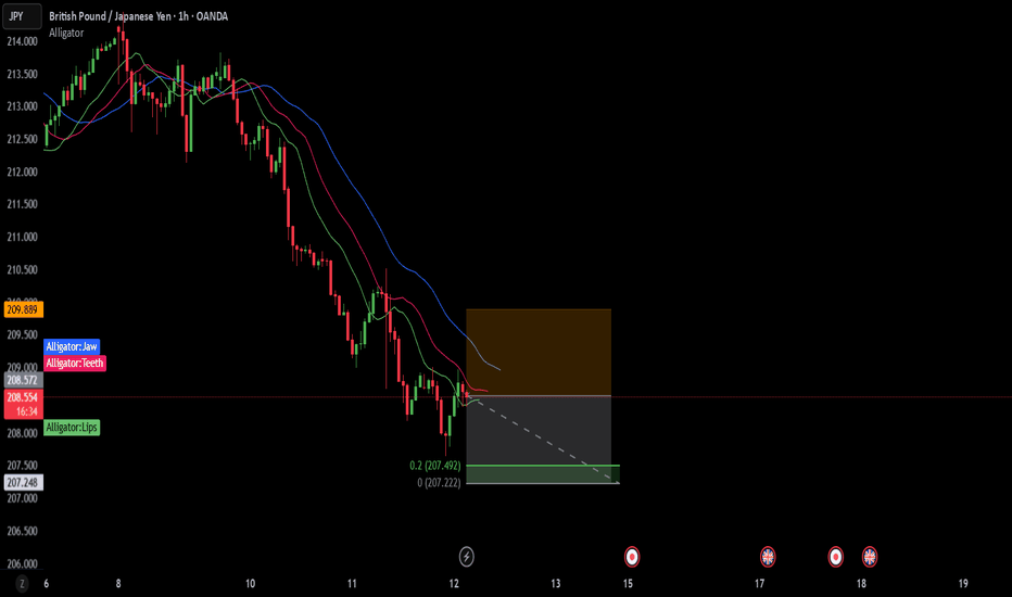 GBPJPY Sell CallPair is Bearish with a heatmap value of -2.55, confirming Bear strength. The bias is fully aligned: Alligator = Sell, 4H Alligator mouth open to the downside, 1H trend = Sell.