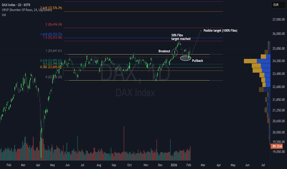 DAX breakout zone retest support at 24400The DAX remains in a bullish trend, with recent price action showing signs of a corrective pullback within the broader uptrend.