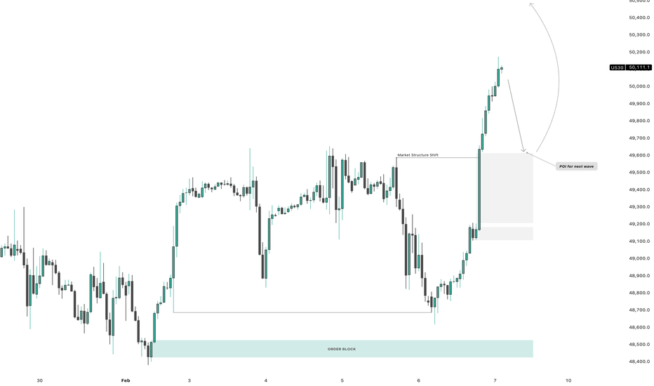 US30 H1 Bullish SetupUS30 has delivered a clean bullish Market Structure Shift (MSS) after a strong impulsive rally from the higher-timeframe order block. The move shows clear displacement, confirming institutional participation and a shift in short-term order flow.